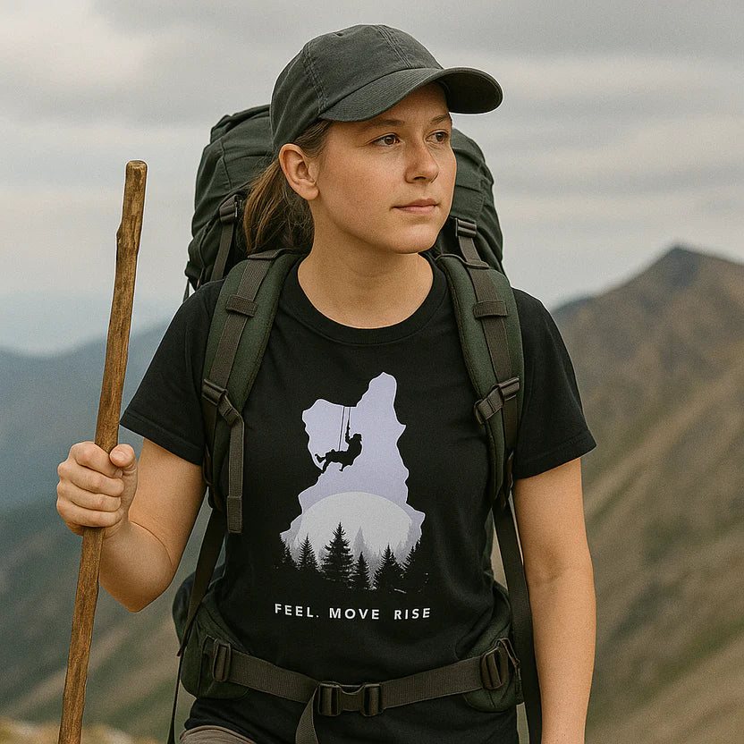 Featuring a minimalist mountain design with the silhouette of a climber ascending toward the light, this shirt captures the essence of resilience, courage, and transformation. The soft lavender gradient and forest base create a sense of calm strength — reminding you that every challenge is an opportunity to grow and rise again.