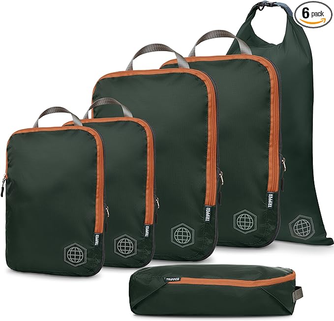 Compression Packing Cubes for Travel - Luggage and Backpack Organizer Packaging Cubes for Clothes (Green and Brown, 6Piece)